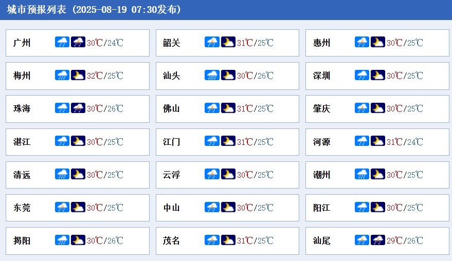 19日,西部市县中到大雨局部暴雨转阵雨,粤东沿海市县多云到阴天,有中(雷)雨局部暴雨,其余市县多云,有分散(雷)雨。最高气温:大部分市县29~33℃。